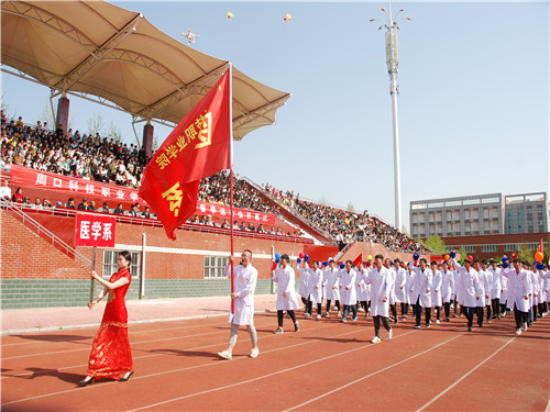 頓時,音樂響起,各參賽代表隊進行了入場儀式。首先,國旗護衛(wèi)隊手擎五星紅旗、抬著學院?;者~著矯健的步伐通過主席臺。接著,鮮花隊等各系代表方陣以及裁判員方陣入場。隊員們神采飛揚,英姿颯爽,他們敲響時代的強音,展示出當代大學生的風采,體現(xiàn)了周科師生團結進取、頑強拼搏的精神風貌。