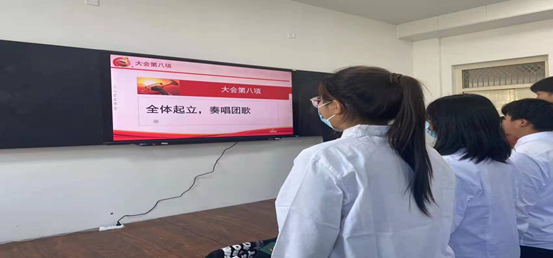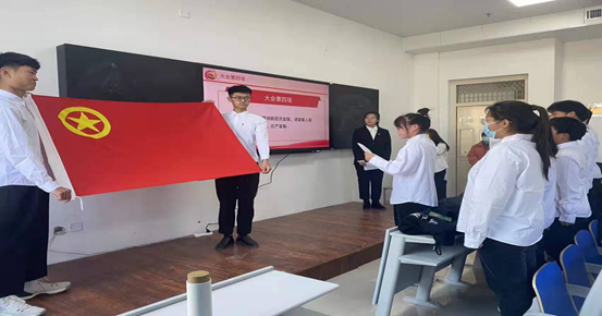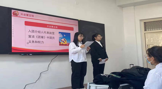 儀式在莊嚴(yán)的國(guó)歌聲中拉開(kāi)序幕,首先由主持人宣讀了新團(tuán)員名單。隨后,團(tuán)總支老團(tuán)員代表向四名新團(tuán)員頒發(fā)團(tuán)證、佩戴團(tuán)徽。佩戴著嶄新的團(tuán)徽,四名新團(tuán)員在老團(tuán)員代表的帶領(lǐng)下,面對(duì)團(tuán)旗,握拳舉起右手,莊嚴(yán)宣誓:“我志愿加入中國(guó)共產(chǎn)主義青年團(tuán),堅(jiān)決擁護(hù)中國(guó)共產(chǎn)黨的領(lǐng)導(dǎo),遵守團(tuán)的章程,執(zhí)行團(tuán)的決議,履行團(tuán)員義務(wù),嚴(yán)守團(tuán)的紀(jì)律,勤奮學(xué)習(xí)……”新團(tuán)員的宣誓慷慨激昂,表達(dá)了他們堅(jiān)定的信念。宣誓過(guò)后,由入團(tuán)介紹人趙昱同學(xué)為新團(tuán)員宣讀團(tuán)員的權(quán)利與義務(wù)、團(tuán)員應(yīng)遵循的規(guī)章制度,隨后,新團(tuán)員代表尚哲龍和老團(tuán)員代表先后發(fā)言,老團(tuán)員代表發(fā)言中表達(dá)了對(duì)新團(tuán)員的熱烈祝賀和殷切希望,新團(tuán)員代表則表示一定時(shí)刻牢記入團(tuán)誓詞,刻苦學(xué)習(xí)、努力拼搏、爭(zhēng)取早日成為社會(huì)主義合格的建設(shè)者和可靠的接班人。